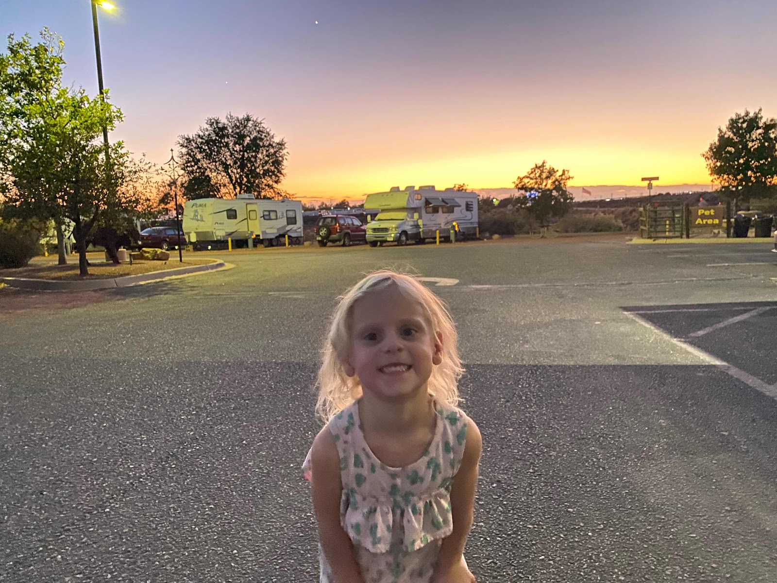 Just before noon, it was back on the road for another 6 hour trek west. We did it with 2.5 stops and pulled into Albuquerque (yay for spell check or I’d never get that right!) just before 7pm. The boys got the rig all situated while Elizabeth and Mom explore the RV park.